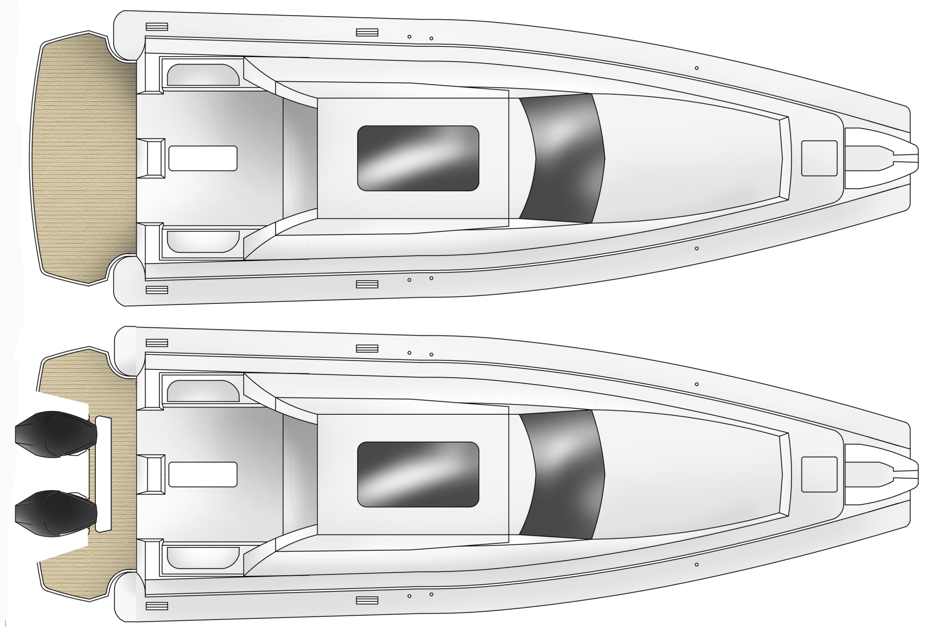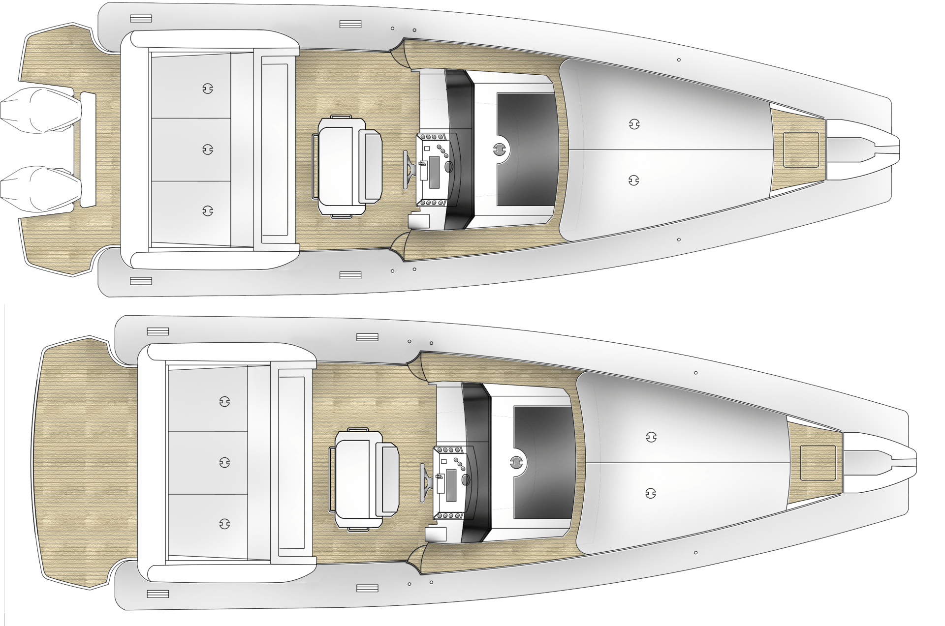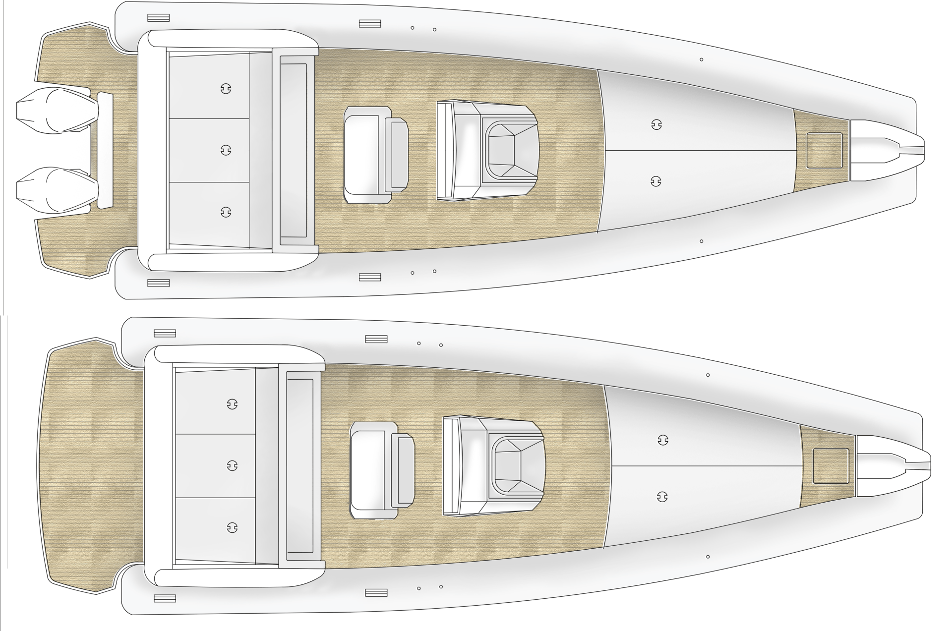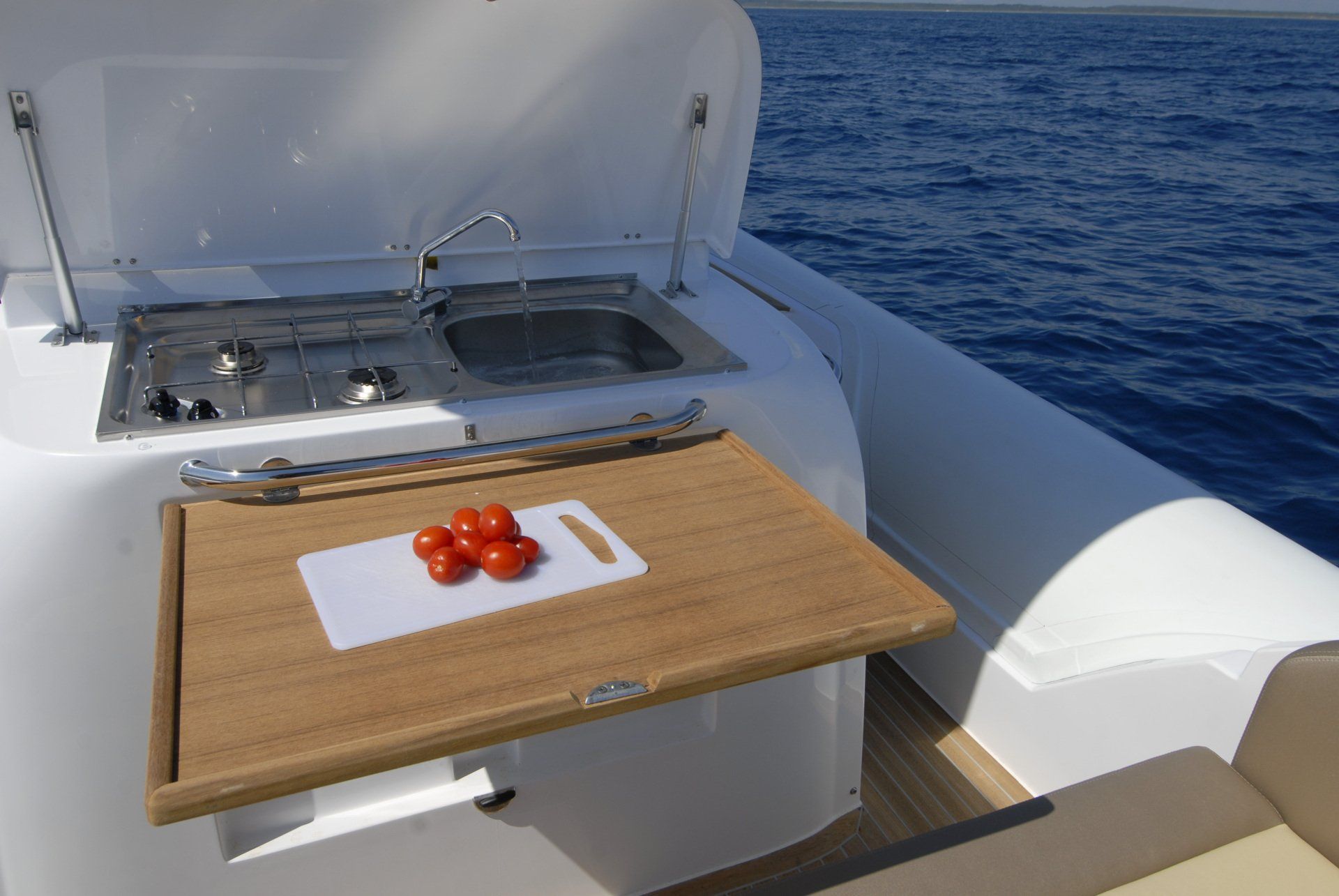 Gli spazi esterni sono caratterizzati da ampi prendisole di prua e di poppa, una area living nel pozzetto incorniciata da un hard top perfettamente richiudibile per proteggere l'equipaggio dagli agenti atmosferici. Sottocoperta nell'ampio open space trovano spazio una dinette completa di cucina, un bagno separato ed una confortevole cuccetta armatoriale.