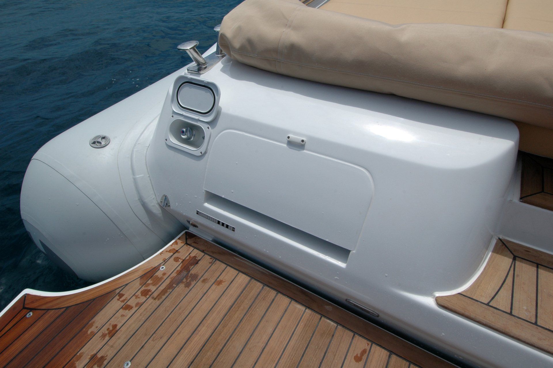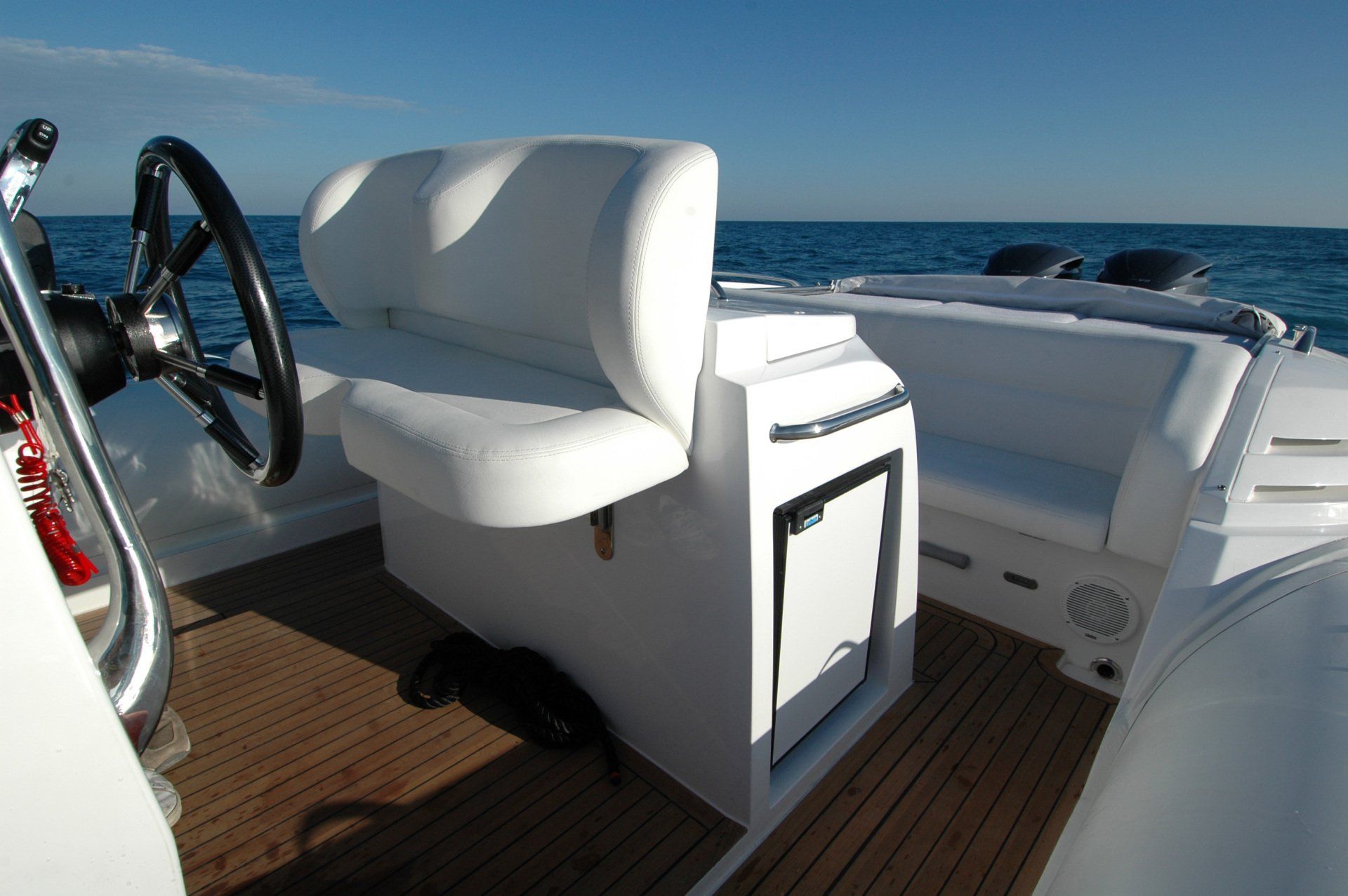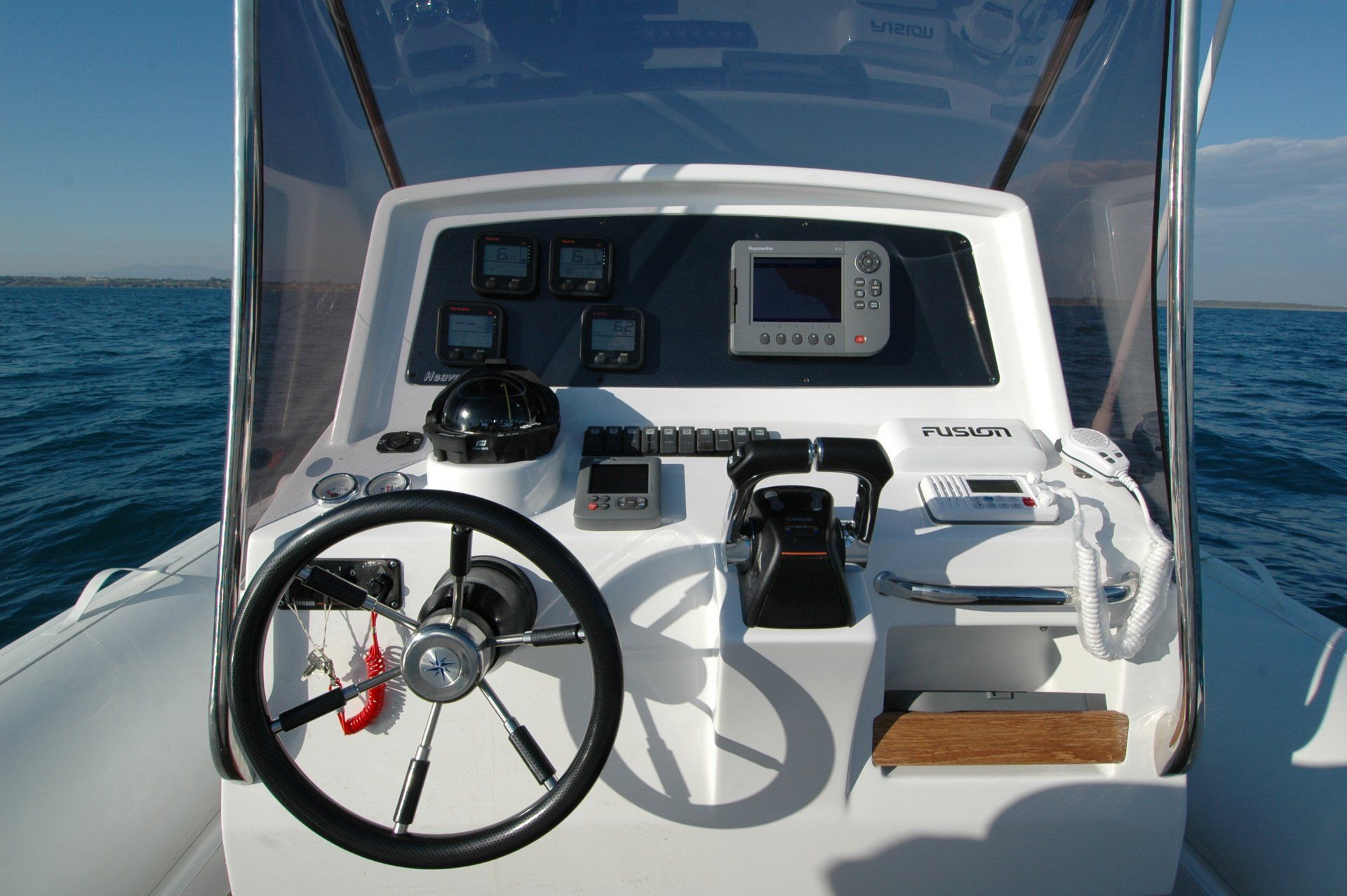 A prua, l'ampio prendisole è il posto perfetto per vivere il mare in pieno relax. La consolle di guida è ampia e permette al pilota e co-pilota di godersi la traversata al massimo delle prestazioni di questo gommone.