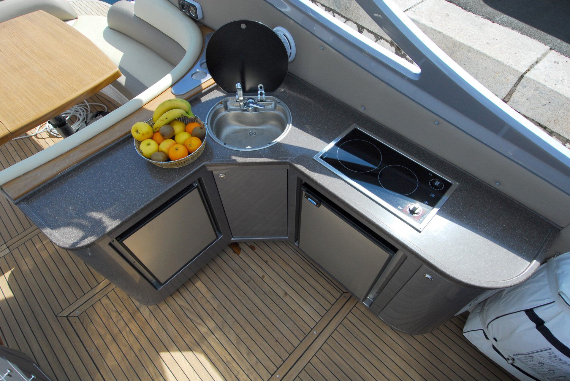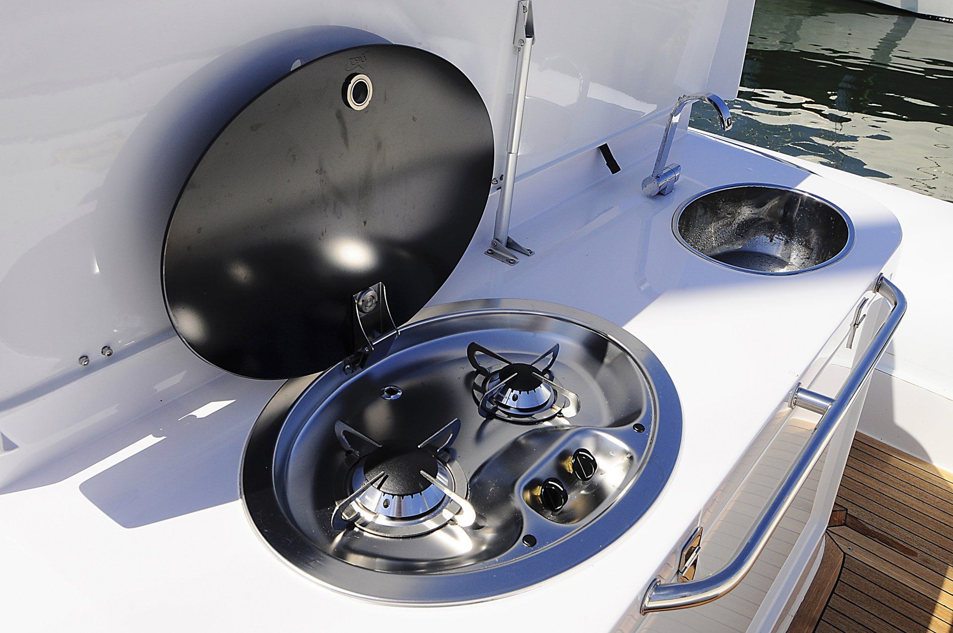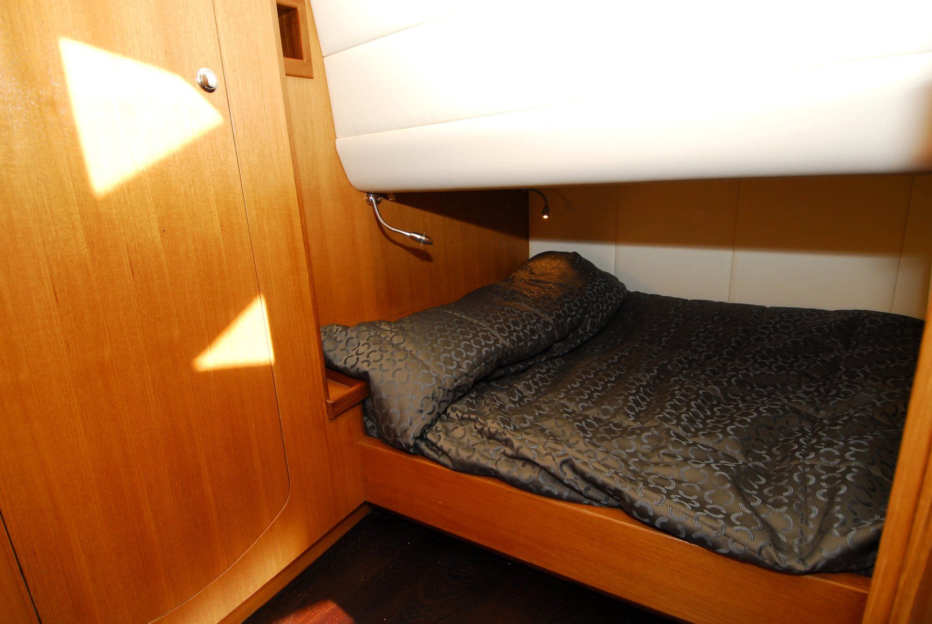 Nel pozzetto dotato di divano si colloca un blocco cucina completamente configurabile secondo esigenze. La consolle di guida è di ampie dimensione, ideale per accogliere la sofisticata strumentazione elettronica. Sottocoperta la una cabina che offre un grande letto prodiero per tre persone, un mobiletto all’ingresso e un generoso locale toilette separato con doccia e un’altezza interna commisurata anche alle persone più alte.