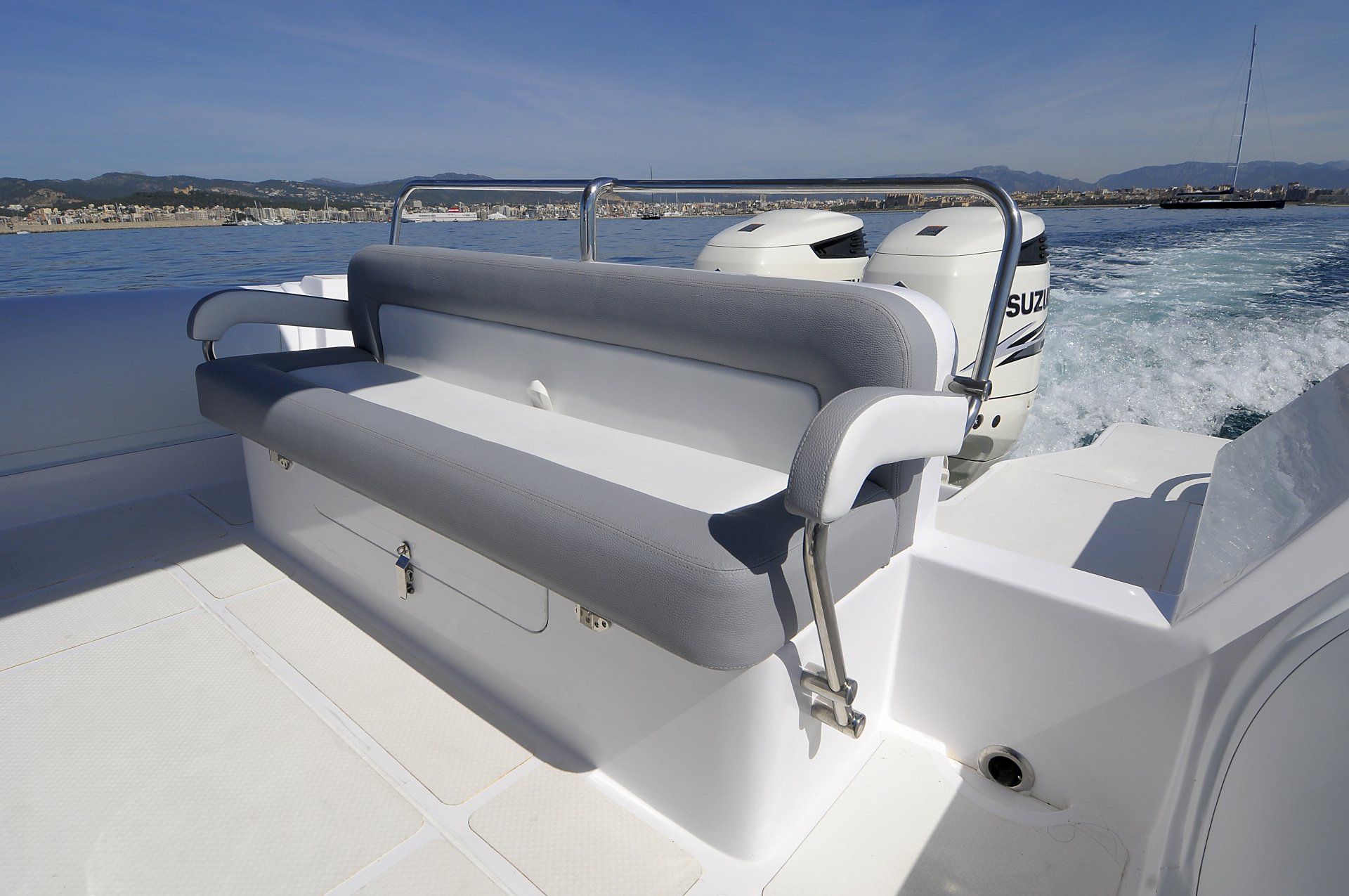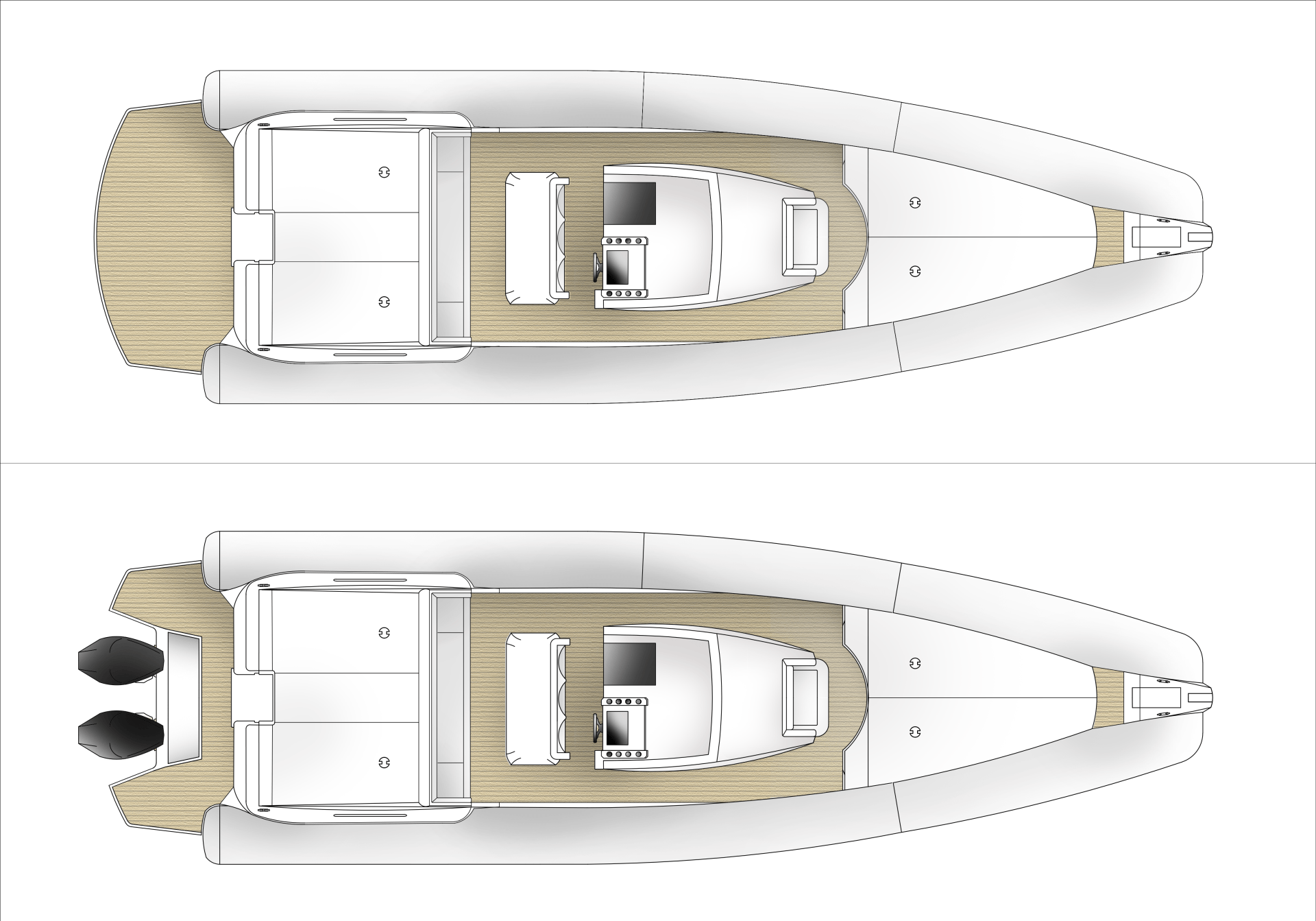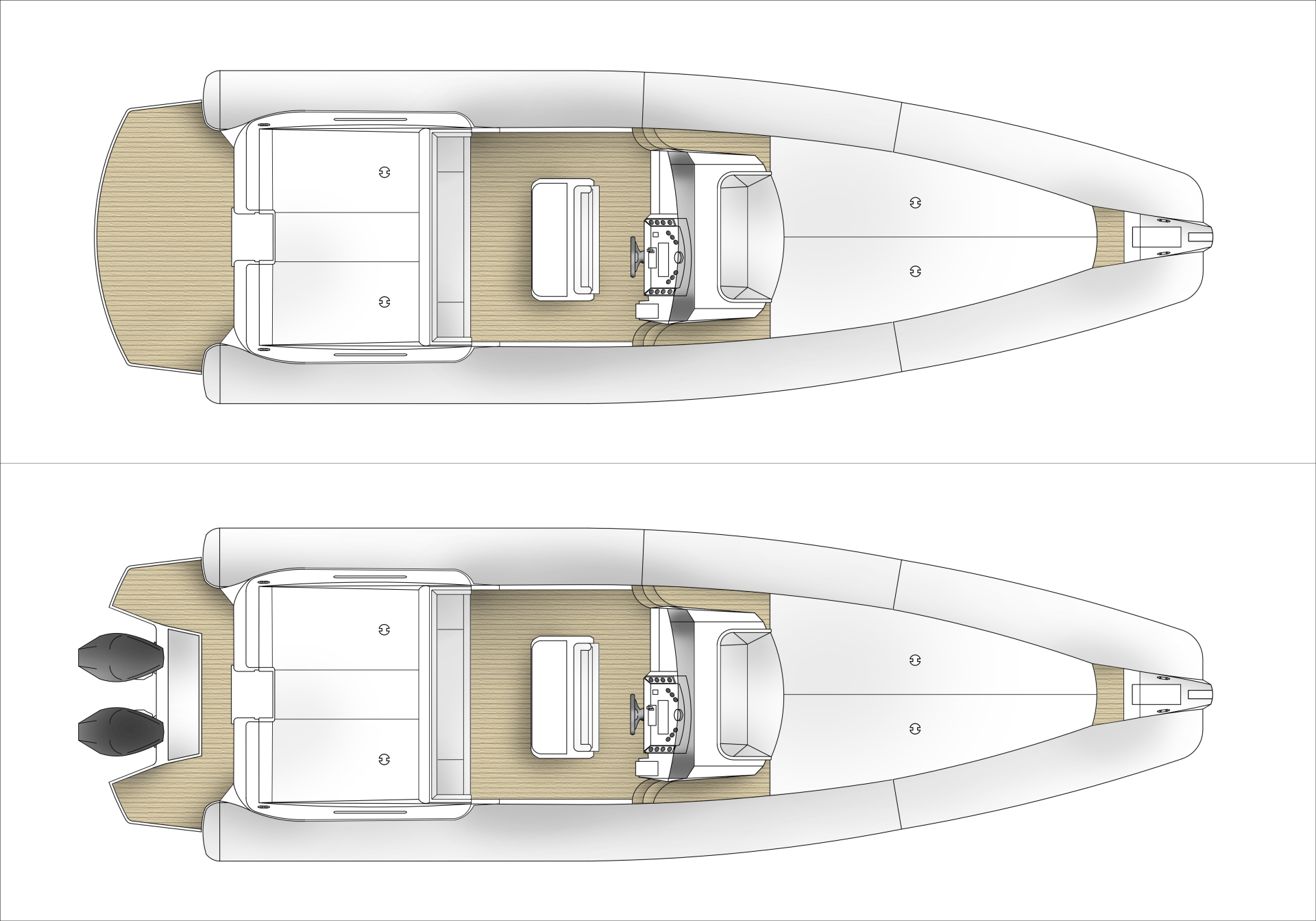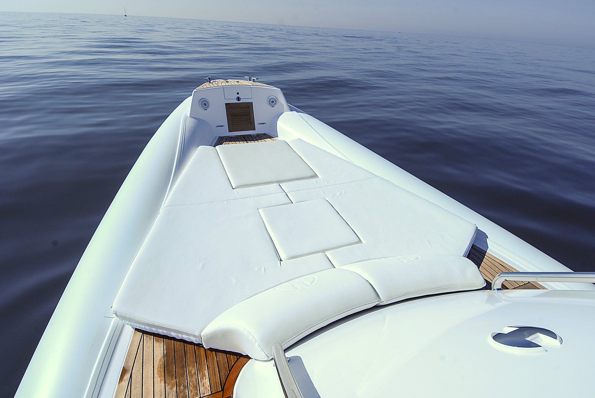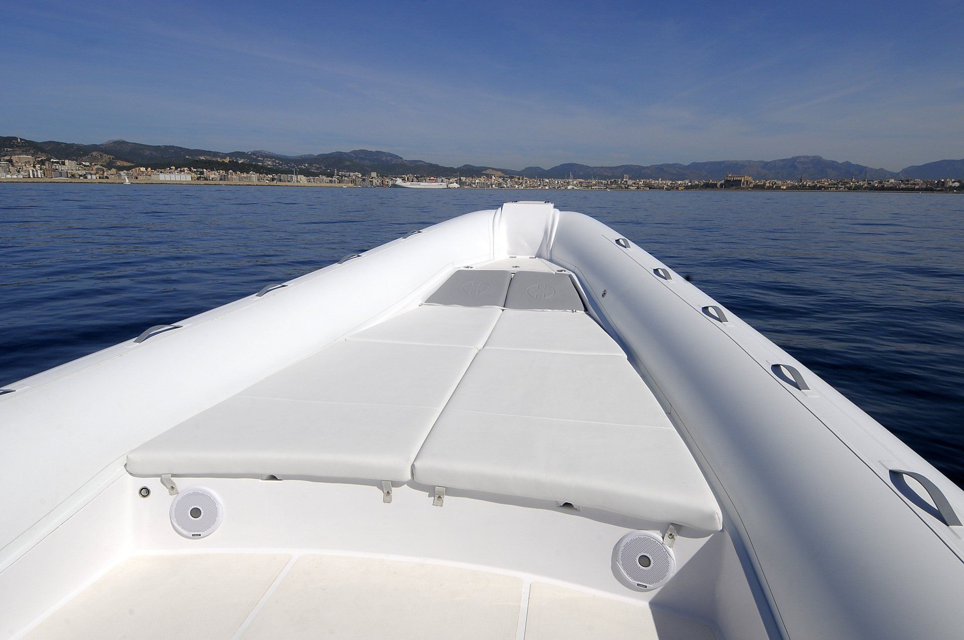 Questo rib dedica la maggior parte dello spazio disponibile alla vita di bordo all’aria aperta, come ben evidenziato dalle ampie superfici prendisole di prua e di poppa e anche dalla notevole estensione del pagliolato, che consente un transito comodo e sicuro in tutte le direzioni.